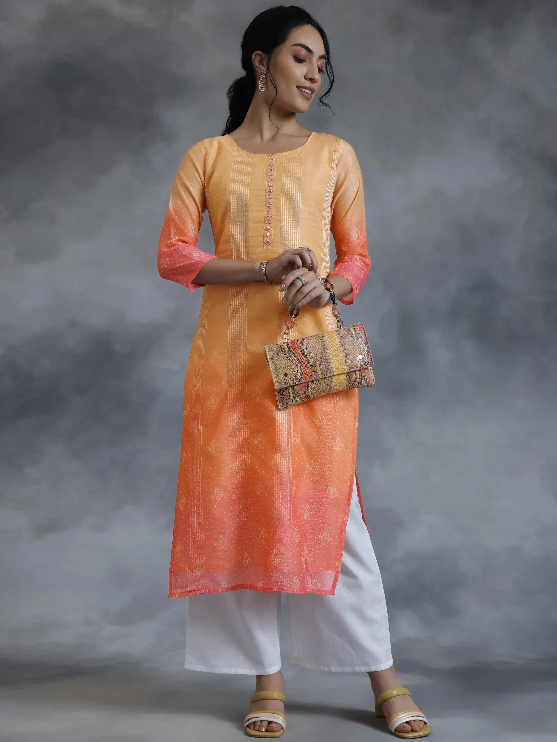 Peach Embellished Chanderi Silk Straight Kurta
